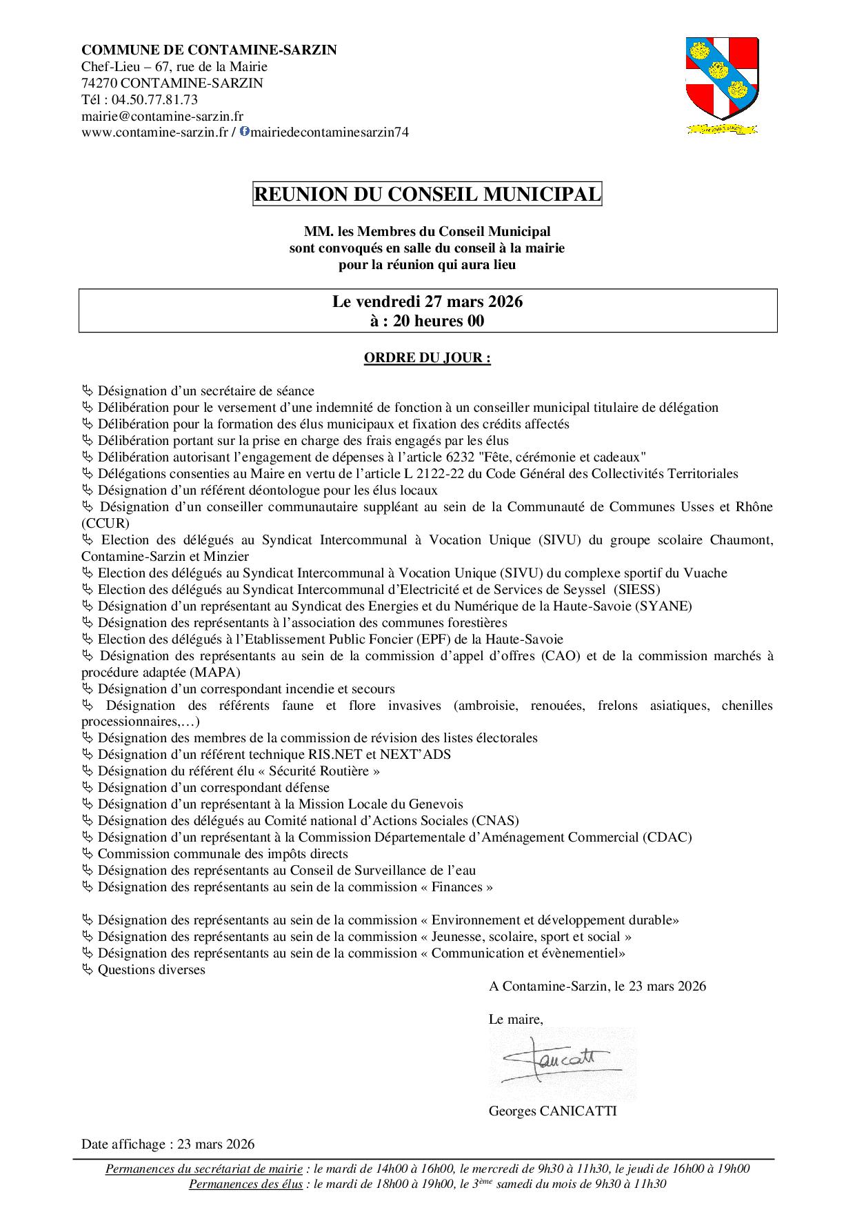 Vous êtes ici : Accueil > Mairie > Conseil municipal > Conseils municipaux, délibérations et décisions du Maire > 2026 > Conseil municipal du 27 mars 2026